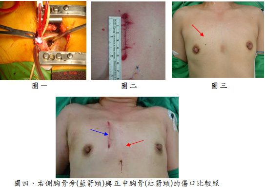 就二尖瓣及三尖瓣手術而言,除了上述經由右胸骨旁的手術方法之外,亦可藉由內視鏡輔助以特殊的器械,經由胸腔右側或右前側(圖五至九),下刀處在右側乳房下第三或第四肋間,傷口大小約3.5~5公分刀痕沿乳房邊緣或是腋下,有些病人再視需要增加右(左)外腹股溝處約2~3公分的小傷口,插入動、靜脈導管進行體外循環。 以極小的傷口來完成手術。對女性而言,這樣的手術方式更有莫大的好處,因為傷口可以藏在乳房外側(圖十、十一)或下緣,合乎需求的美觀,日後對外觀的影響可以降到最低。