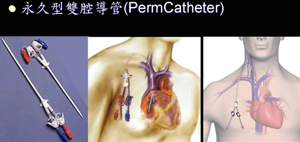 - 其他併發症:栓塞、動靜脈瘻管、心律不整等小於1%。與永久性導管置入術相關之死亡率小於0.01%。少數病人會因處置過程或其他因素造成導管或傷口的感染。