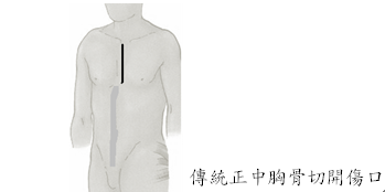 升主動脈瘤或主動脈弓瘤:採正中胸骨切開術。正中胸骨切開術可以提供最寬廣的手術視野,將整個心臟及主動脈、肺動脈與腔靜脈等大血管的構造看得很清楚,手術比較容易進行。