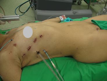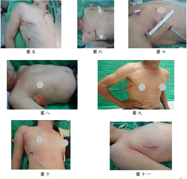 就二尖瓣及三尖瓣手術而言,除了上述經由右胸骨旁的手術方法之外,亦可藉由內視鏡輔助以特殊的器械,經由胸腔右側或右前側(圖五至九),下刀處在右側乳房下第三或第四肋間,傷口大小約3.5~5公分刀痕沿乳房邊緣或是腋下,有些病人再視需要增加右(左)外腹股溝處約2~3公分的小傷口,插入動、靜脈導管進行體外循環。 以極小的傷口來完成手術。對女性而言,這樣的手術方式更有莫大的好處,因為傷口可以藏在乳房外側(圖十、十一)或下緣,合乎需求的美觀,日後對外觀的影響可以降到最低。