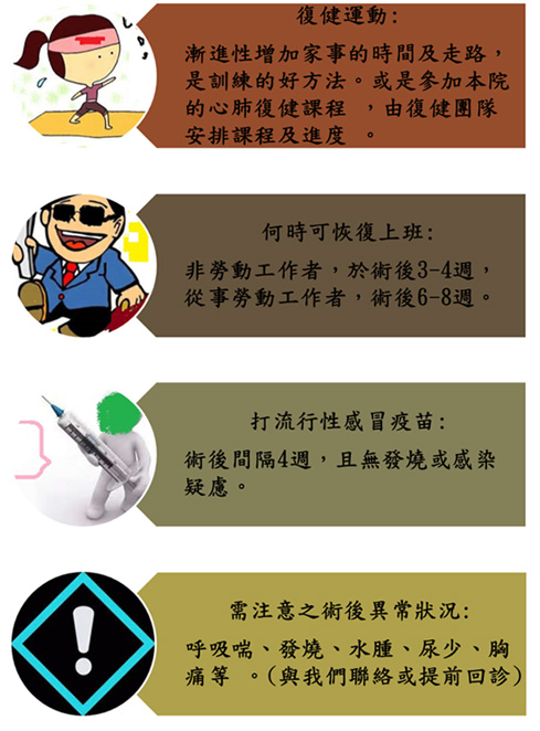 開心手術衛教-居家照護須知(一)簡易圖示版 更新/審視日期:2025-12-27 親愛的開心病患及家屬: 開心手術後經過一段時間的術後恢復期,恭喜您可以出院了。此衛教單張提供您返家後的常見的注意事項及居家照護,歡迎您與我們共同討論,期望您能有更好的生活品質。 諮詢服務電話: (02)8966-7000 轉4791~4794或 4799 心臟外科值班手機: 0926-006923 (24小時, 僅供緊急連繫使用 )